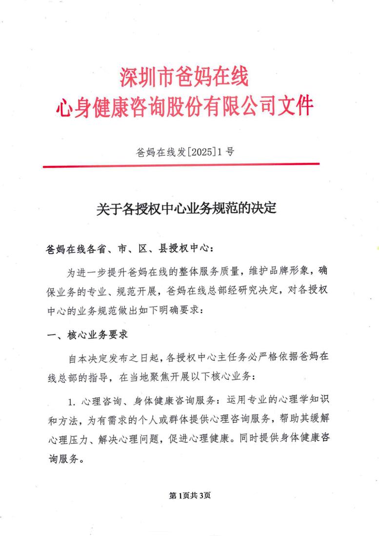 自本決定發布之日起,各授權中心主任務必嚴格依據爸媽在線總部的指導,在當地聚焦開展以下核心業務: