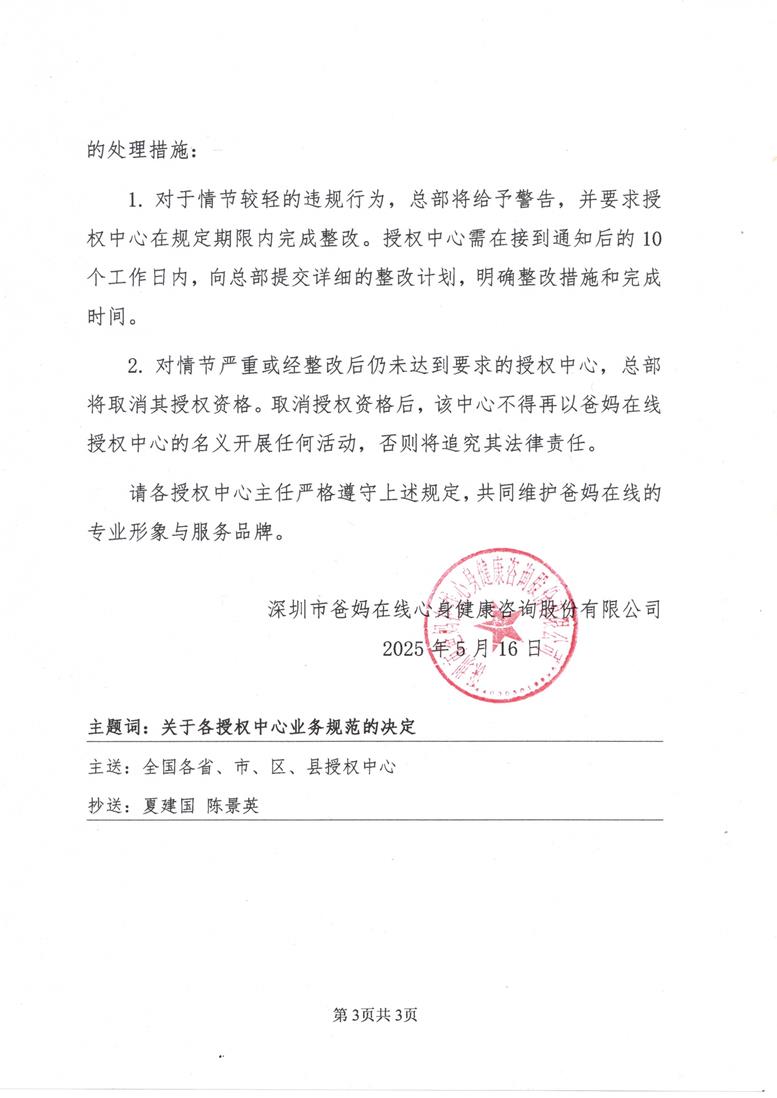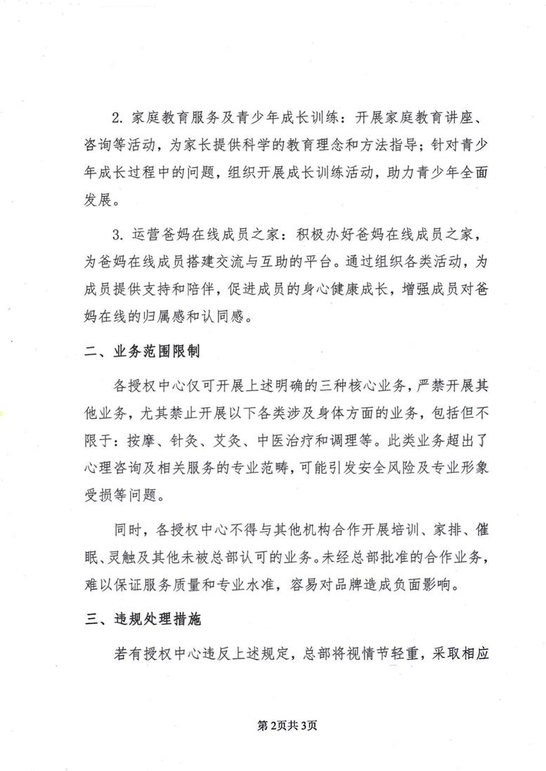 2. 對情節嚴重或經整改后仍未達到要求的授權中心,總部將取消其授權資格。取消授權資格后,該中心不得再以爸媽在線授權中心的名義開展任何活動,否則將追究其法律責任。